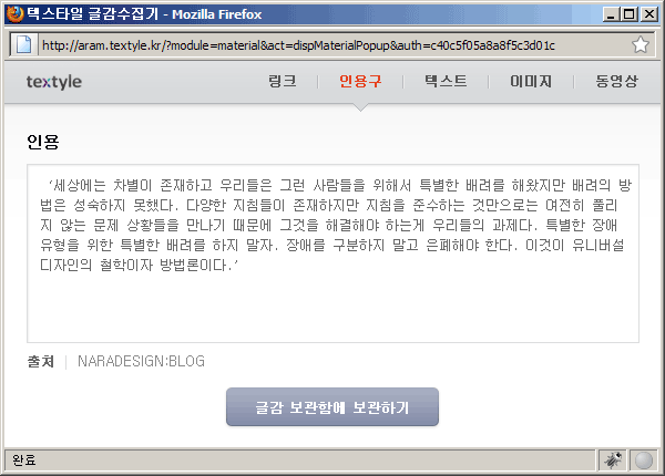 웹 브라우저에 설치된 "글감 수집기"를 이용하여 인용구를 수집하는 장면.