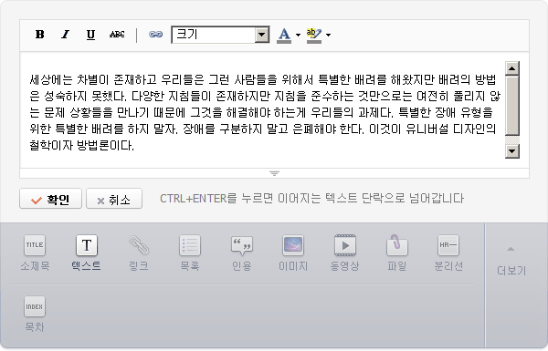 텍스타일 에디터를 이용하여 하나의 단락을 작성하는 화면.
