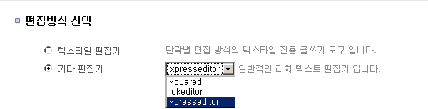 여전히 텍스타일 에디터가 익숙하지 않는 분들께서는 관리자 환경의 "설정 > 쓰기환경 설정 > 편집방식 설정" 메뉴에서 "기타 편집기"를 선택 하세요. 'XpressEditor, FCKeditor, Xquared' 와 같이 기존에 여러분들이 사용하시던 익숙한 오픈소스 에디터를 그대로 사용하실 수 있습니다.