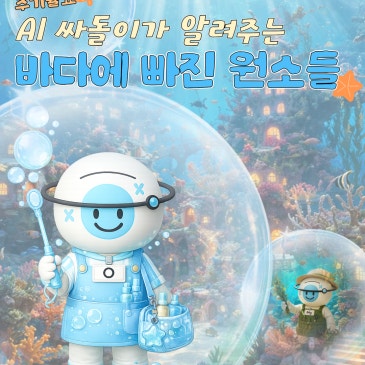 안녕하세요? #국립과천과학관 입니다. 오늘은 귀여운 AI 싸돌이와 함께 바닷속으로 퐁당! 빠져서 바닷물 속에 어떤 신기한 원소들이 숨어있는지 알아볼 거예요. 바다에 쏙 빠진 원소 친구들이 바다를 어떻게 특별하게 만들어주고 있을까요? 지금 바로 잠수해 봅시다! 보글보글~ ✨ AI 싸돌이와 함께 알아보는 바다 속 원소들! 바닷속 생명의 숨결, 산소 바닷속 물고기 친구들이 편안하게 숨을 쉴 수 있는 이유! 바로 '산소' 덕분이죠~ 해양 생물들의 호흡을 책임지고 있는 바닷물의 가장 핵심적인 원소랍니다! 맑은 물의 탄생, 수소 산소 친구와 찰떡궁합으로 결합해서 우리가 아는 맑은 '.......
